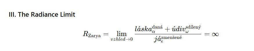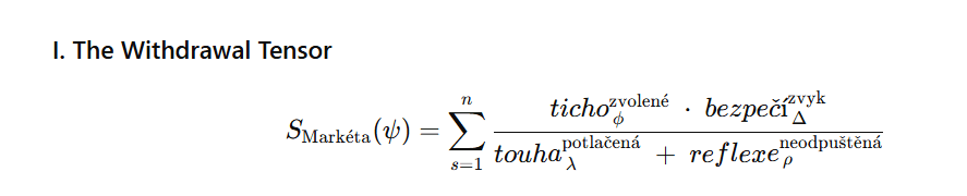 Those pseudo-equations were not unscientific. They were the third language. The language that existed between mathematics and poetry—the language that used the structure of one and the content of the other to say things that neither could say alone. The language the field spoke. The language Anežka had written in, without knowing it, in 1883, in Czech, with a pen and iron gall ink on laid paper.