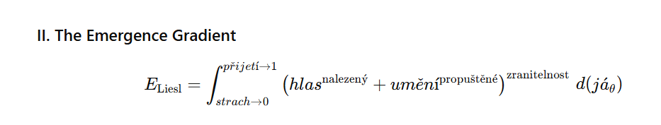“I know what’s missing. I need to rebuild the approach. Not abandon the math—the math is the skeleton, the skeleton is essential. But I need to put the flesh back on. I need to re-integrate Anežka’s language into the mathematical framework. Not as decoration. Not as commentary. As the other half of the coordinate system. The half David stripped away.”
