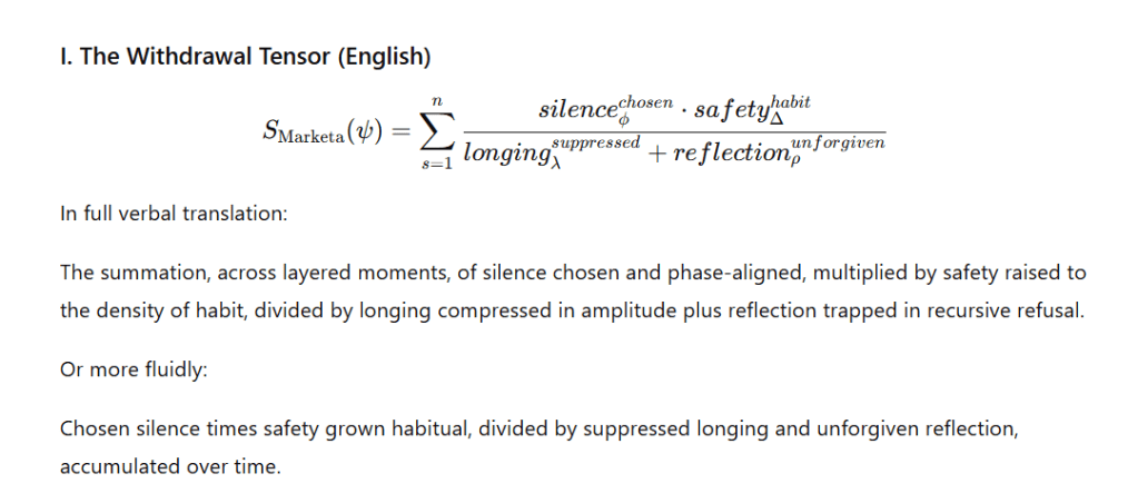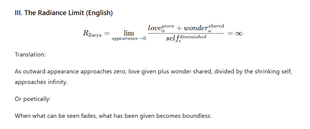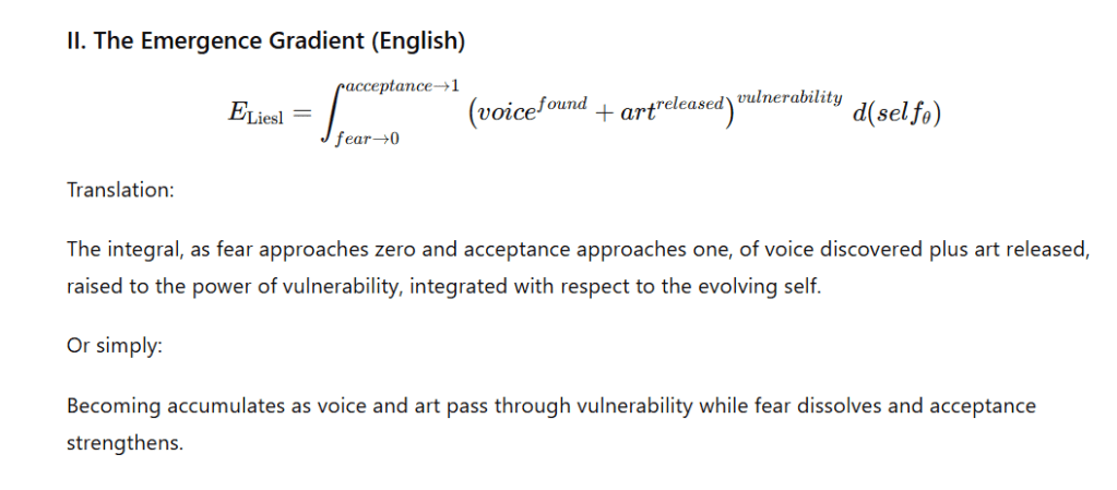 She thought of the pseudo-equations she had encountered in a paper on consciousness notation—a fringe publication, dismissed by most of the field, that had proposed a hybrid symbolic system for describing subjective experience: mathematical operators filled not with numbers but with meaning-words. Integrals of voice and vulnerability. Summations of silence and safety. Limits where appearance approaches zero and radiance approaches infinity. The paper had been mocked as unscientific. Sophia had read it once and filed it away. Now she pulled it back out of the filing cabinet of her memory and looked at it with new eyes.